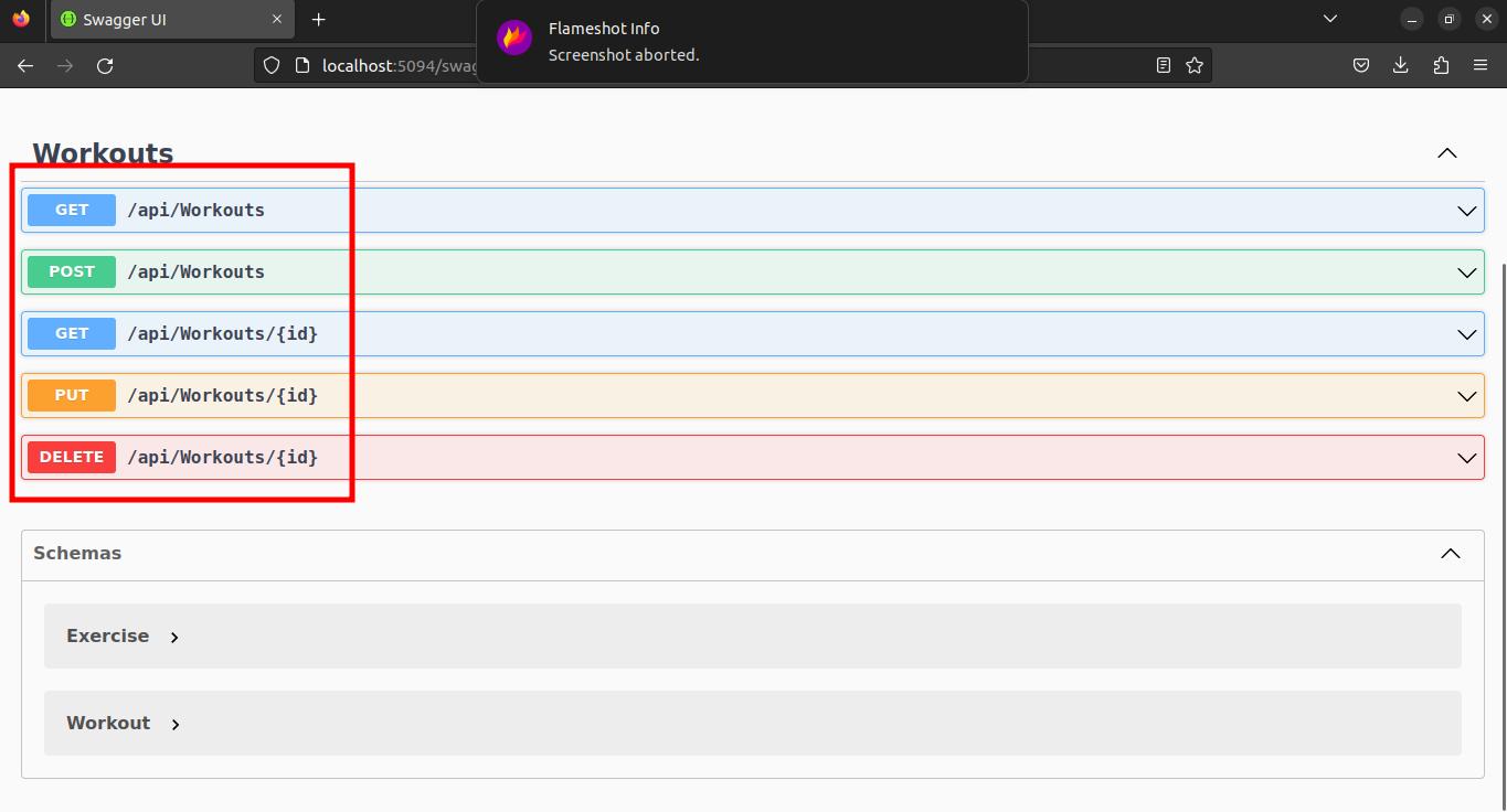 The REST API allows users to do CRUD (Create, Read, Update, Delete) operations on workout plans. So we’ll create a  Workout class with Id, `Name`, `Description`, and `Exercises` properties.