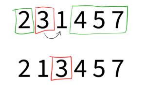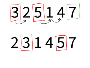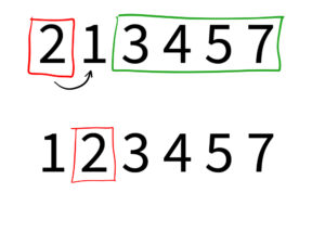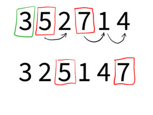 This image shows us the very first iteration of our outer loop. You can see that 3 will stay in the same place as it is smaller than 5. However, 5 and 7 will be moved to the right for one and two places, respectively.