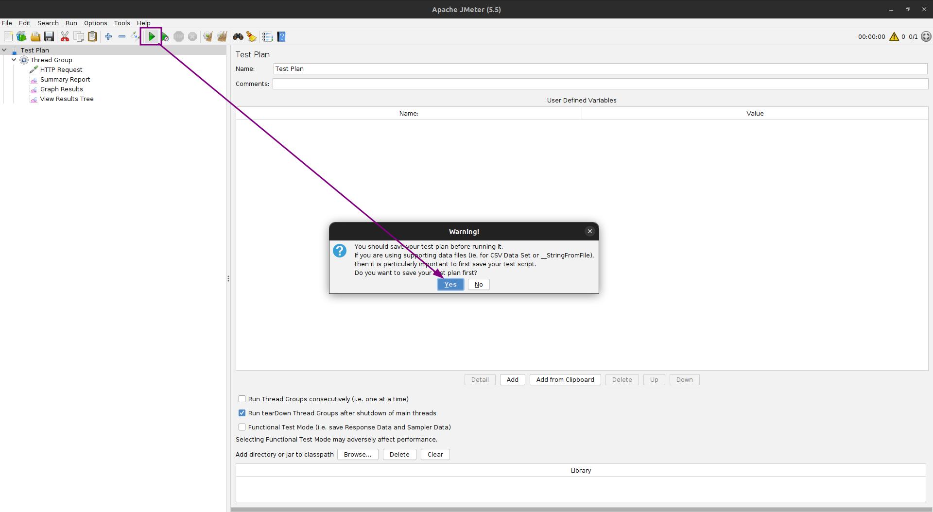 Once you’ve set up your test plan, Thread Group, HTTP Request, and Listeners, you’re ready to run the load test. Click on the green “Play” button in the toolbar to start the test, and save your test to be able to run it as you need it.