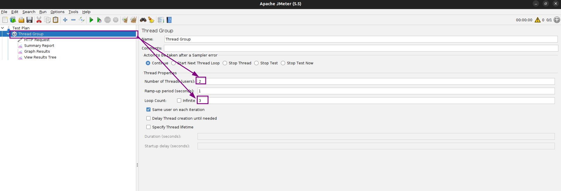 • The number of users is specified in the Thread Group and determines how many users (threads) will be simulated during the test. The higher the number of users, the greater the load on the web application.