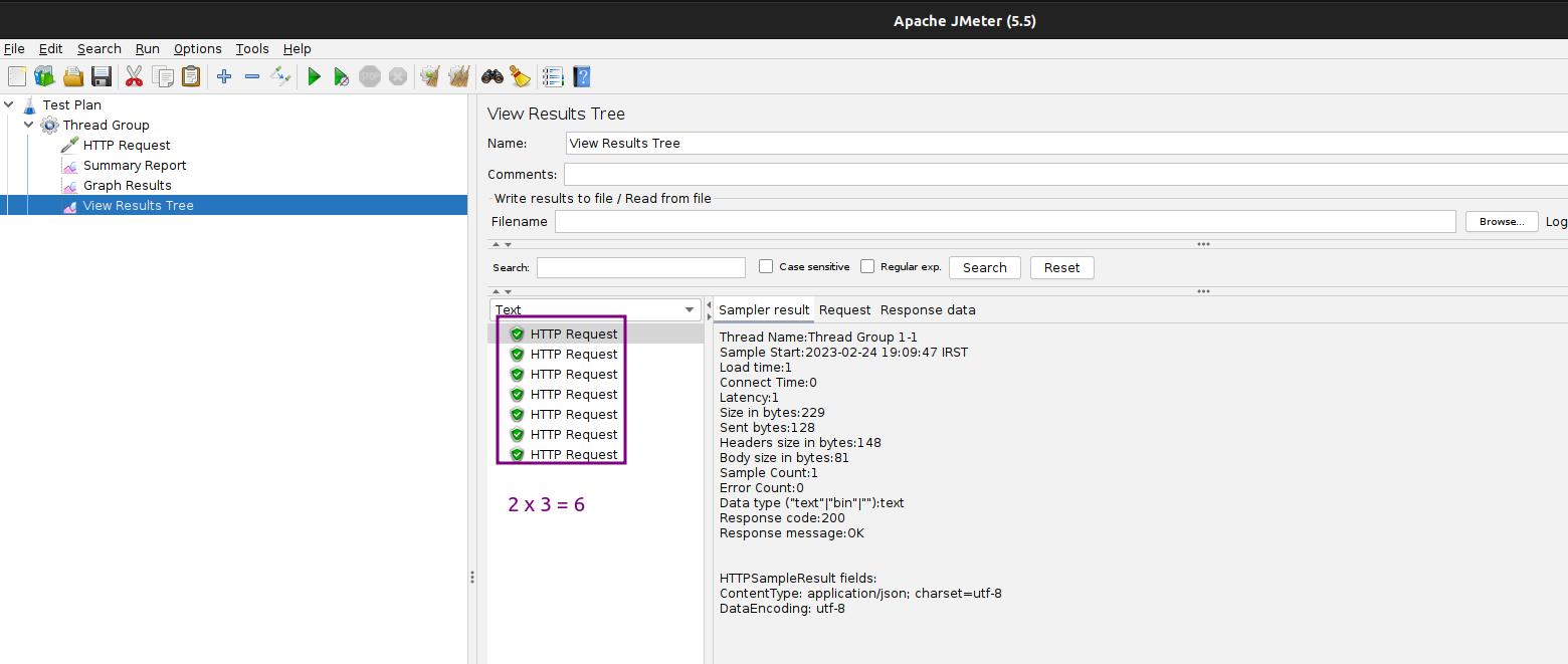 The test is run 6 times because we set the Number of Threads(users) to 2 and the Loop Count to 3.